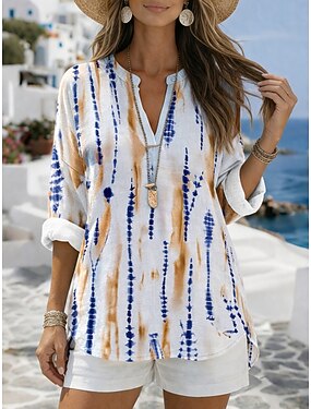 女性用 ブラウス プリント グラフィック 幾何学模様 ヴィンテージ 日常 スタイリッシュ 長袖 Vネック レギュラートップス カジュアル 日常 祝日 ブルー イエロー パープル オレンジ 夏 春