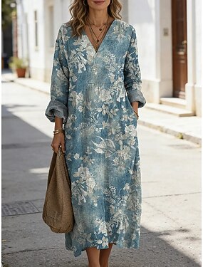女性用 ミディドレス シフトドレス カジュアル 日常 お出かけ ルーズフィット フラワー グラフィック 長袖 Vネック ブルー ルビーレッド オレンジ 夏 春