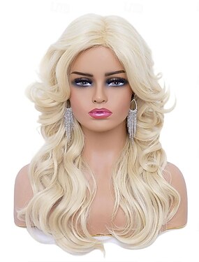女性用ロングブロンドウィッグ、ヴィンテージウォーターウェーブゴールドウィッグ、前髪付き、ハロウィン用日常使いの合成レトロウィッグ