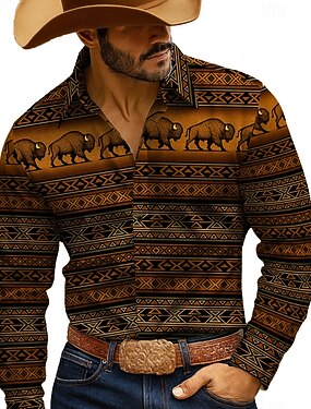 男性用 バッファローチェック柄 カウボーイ インドの文化 シャツ ウエスタンシャツ ボタンアップシャツ 長袖 ヴィンテージレトロ アウトドア カジュアル 作業服 春 秋 折襟 3Dプリント 襟付きシャツ ブルー ブラウン グリーン