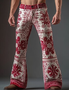 クリスマス 男性用 スノーフレーク柄 クリスマス・コスチューム ディスコパンツ 60年代 70年代 ベルボトム ミディアムウエスト 西洋料理 ヴィンテージレトロ アウトドア 祝日 サイドポケット フレアレッグパンツ 春 秋 3Dプリント ルビーレッド