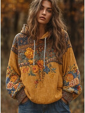 女性の3Dプリントビンテージボヘミアンフーディーパッチワークフーディースウェットシャツ花柄プルオーバースウェットシャツエレガント暖かいビンテージ長袖フード付きストリートデイリーウェアカジュアルパッチワークプリントイエロー春秋冬