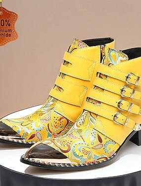 メンズ本革イエロー刺繍アンクルブーツ、マルチバックルストラップ付き - ユニークなゴシックスタイルのパーティーやコンサートの靴