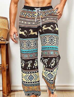男性用 エスニック ココペリ ズボン バギーパンツ カジュアルパンツ ミディアムウエスト ヴィンテージレトロ トライバル風 バケーション 祝日 ビーチウェア ドローストリング 弾性ウエスト ワイドレッグ 夏 春 3Dプリント ブラック