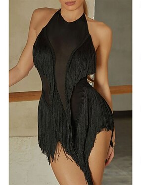 ラテンダンス ドレス タッセル ピュアカラー スプライシング 女性用 性能 訓練 ノースリーブ ハイウエスト スパンデックス
