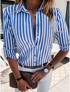 女性用 ブラウス ボタン プリント ストライプ スタイリッシュ カジュアル 長袖 シャツカラー レギュラートップス 日常 ブルー ピンク グリーン 夏 春 秋