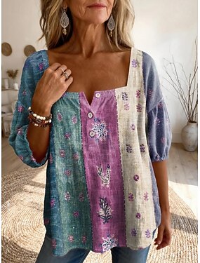 女性用 カジュアルシャツ ブラウス プリント フラワー グラフィック エレガント 旅行度假风 スタイリッシュ 七分袖 Vネック レギュラートップス ワーク ビーチ 祝日 ブルー ホワイト ピンク パープル グリーン 夏 春 秋 冬