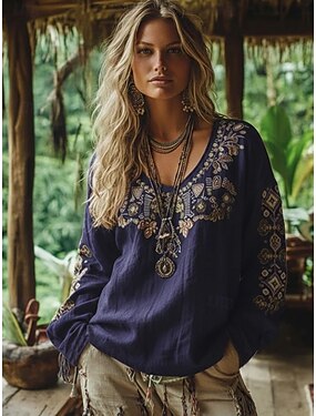 女性用シャツ リネンのような通気性のある軽量フローラル グラフィック エレガント ボヘミア 日常 長袖 シャツ カラー 仕事 日常 ラッチャード 刺繡 ボタン ブルー パープル ブラウン グリーン スプリング 秋 冬