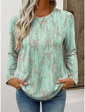 女性用 Tシャツ プリント フラワー グラフィック 植物 ヴィンテージ スタイリッシュ クラシック 長袖 クルーネック レギュラートップス 日常 週末 ブルー ピンク パープル グリーン 春 秋