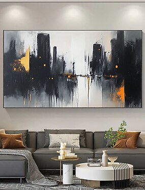 手描きの大きな抽象的な黒と金の都市景観の油絵壁アート絵画モダンなニュートラルな壁の装飾モダンなグレーの都市景観の装飾