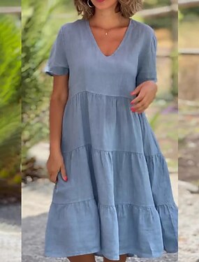 女性用 ミニドレス フェイクコットンリネン カジュアルドレス コットンワンピース エレガント ファッション 近代の アウトドア バケーション お出かけ ルーズフィット 平織り 半袖 Vネック ブルー ブラック ルビーレッド オレンジ 夏 春