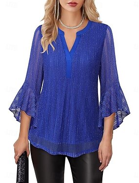 女性用 シャツ ブラウス メッシュ 平織り スタイリッシュ クラシック 近代の 七分袖 Vネック レギュラートップス 日常 祝日 お出かけ ブルー ブラック イエロー ピンク ルビーレッド 夏 春