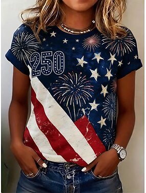 アメリカ独立記念日 女性用 Tシャツ プリント グラフィック レタード アメリカの国旗 ヴィンテージ スタイリッシュ クラシック 半袖 クルーネック レギュラートップス 日常 ホワイト ルビーレッド ネイビーブルー レッドとブルー 夏 春