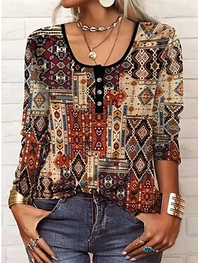 女性用 チュニック Tシャツ フラワー グラフィック 幾何学模様 スタイリッシュ カジュアル ボヘミアン 長袖 クルーネック レギュラートップス 日常 お出かけ 週末 ブラック ルビーレッド オレンジ ブラウン カーキ色 秋 冬