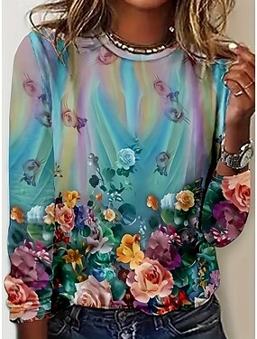 女性用 Tシャツ プリント フラワー グラフィック 植物 ボヘミア ヴィンテージ スタイリッシュ 長袖 クルーネック レギュラートップス 日常 週末 バケーションウェア ブルー ブラック イエロー ルビーレッド パープル 夏 春