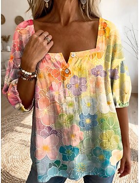 女性用 シャツ チュニック 夏のトップス ボタン フラワー グラフィック 旅行度假风 ヴィンテージ 日常 長袖 Vネック レギュラートップス 日常 祝日 お出かけ ブルー イエロー ルビーレッド グリーン 夏 春
