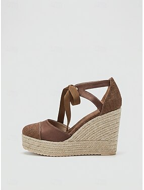 レディース ブラウン エスパドリーユ ウェッジサンダル リボン付き アンクルストラップ – バケーション &リゾートイブニングシューズ