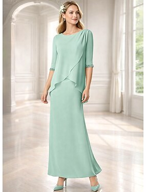 ツーピース ドレススーツ アンクル丈 ウェディングゲストドレス マダムドS 長袖 クルーネック エレガント 結婚式のゲスト 教会 シフォン 〜と レース 刺繍