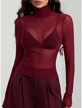 女性用 ブラウス パッチワーク メッシュ 純色 エレガント スタイリッシュ ベーシック 長袖 タートルネック レギュラートップス 日常 セージグリーン ブラック ワイン ネイビーブルー ブラウン 夏 春 秋