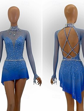フィギュアスケート ドレス 女性用 アイススケート ドレス ブルー パッチワーク オープンバック 伸縮性あり 訓練 競技大会 スケートウェア クラシック クリスタル・ラインストーン 長袖 アイススケート フィギュアスケート