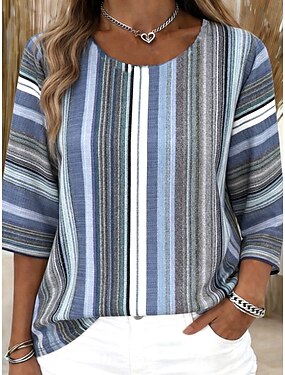 女性用 ブラウス プリント ストライプ グラフィック 幾何学模様 ストライプ ボヘミア トロピカル風 スタイリッシュ 七分袖 ハーフスリーブ クルーネック レギュラートップス 日常 バケーションウェア ブルー 夏 春