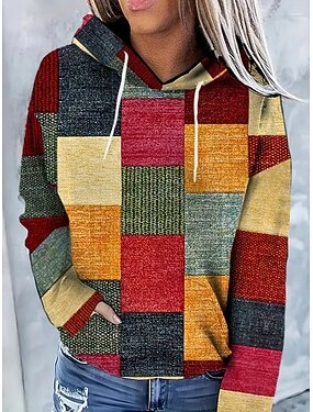 女性用 プルオーバー フーディー スウェットシャツ プリント グラフィック 幾何学模様 あたたか ヴィンテージ ファッション 長袖 フード付き レギュラートップス ストリート 日常着 祝日 オレンジ ライトブルー 秋 冬