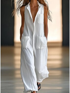 女性用 ジャンプスーツ ストリートファッション 純色 ノースリーブ ワイドレッグ Vネック ポケット 日常 バケーション レギュラー ホワイト 夏