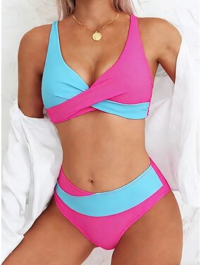 ウィメンズビキニ 2ピース水着 カラーブロック チーキー バックレス バケーション ビーチウェア ハルターネック ノースリーブ水着
