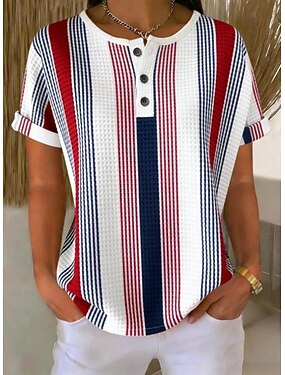 ウィメンズ ワッフル テクスチャ ニット トップス T シャツ カラーブロック グラフィック マーブル ヴィンテージ スタイリッシュ クラシック ショートスリーブ クルーネック ラウンドネック ヘンリー レギュラー トップス デイリー スポーツ ブルー レッド パープル グリーン サマー スプリング