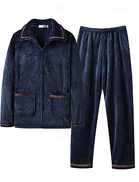 男性用 ネグリジェ パジャマセット パジャマトップとパンツ 1セット 平織り ファッション スタイリッシュ クラシック 家 日常 ベッドサイド フリース ポリエステル 保温 履き心地よい ソフト ラペル 長袖 パンツ 弾性ウエスト ボタン 秋 冬 ネイビーブルー ライト