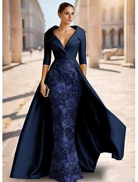 タイト/コラム フロア丈 ビーズ刺繍 フォーマルドレス 花嫁の母のドレス イブニングドレス オーバースカート付きボールガウン フォーマルドレス エレガント 光沢タイプ シルキー 七分袖 ラペル 結婚式 フォーマル ケープ サテン レース とともに グリッター素材