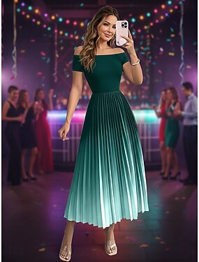 女性用 ミディドレス A ラインドレス プリーツドレス オフショルダードレス エレガント パーティー カクテル アウトドア パーティー 結婚式のゲスト プリーツ プリント スリム 勾配 半袖 オフショルダー ブルー