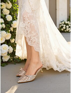 女性用のキラキラ輝くラインストーンミュールブライダルヒール、パールのリボン付き、エレガントな尖ったつま先スリッポンウェディングシューズ、屋外ガーデンに最適 &芝生の儀式