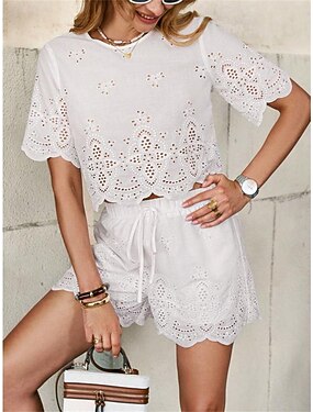 女性用 ショーツセット ボレロトップ 半袖 クルーネック 純色 フリル パッチワーク ホール エレガント 活発的 ファッション カジュアル 日常 アウトドア ホワイト 夏 レギュラー