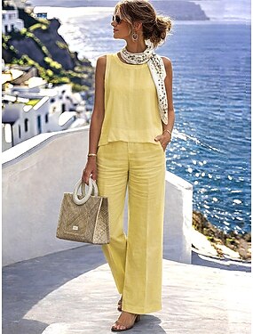 女性用 パンツセット ボレロトップ フェイクコットンリネン ノースリーブ クルーネック 純色 平織り ファッション ストリートファッション カジュアル 日常 アウトドア イエロー 夏 ルーズフィット