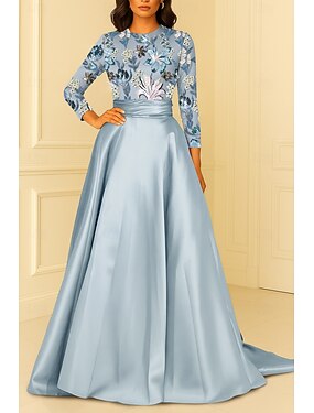 Aライン フロア丈 ビーズ刺繍 フォーマルドレス 花嫁の母のドレス イブニングドレス ボールガウン フォーマルドレス エレガント シルキー 長袖 クルーネック 結婚式 フォーマル ポケット サテン レース とともに ポケット
