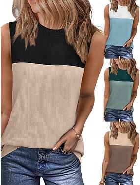女性用 ブラウス パッチワーク カラーブロック ヴィンテージ スタイリッシュ カジュアル ノースリーブ クルーネック レギュラートップス 日常 祝日 お出かけ ピンク スカイブルー ブラウン グリーン アプリコット 夏 春