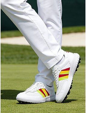 メンズホワイトゴルフスニーカー、カラーストライプのディテールを備えたアスレチックレースアップデザイン、衝撃吸収ソール、ゴルフコース向けのモダンなスポーツスタイル