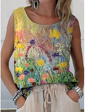 女性用 キャミソールタンクトップ フラワー グラフィック エレガント ボヘミア ヴィンテージ ノースリーブ クルーネック レギュラートップス カジュアル イエロー 夏 春