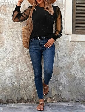 女性用 スパンコール キラキラ パーティー グリッター素材 パッチワーク メッシュ 平織り ファッション 近代の カジュアル 長袖 クルーネック レギュラートップス 日常 週末 ブルー ブラック ワイン 秋 冬
