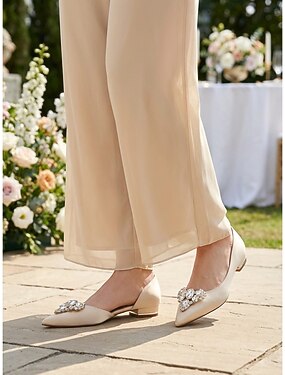クリスタル装飾が施されたライトグレーのポインテッドトゥのレディースフラットシューズ。ガーデンウェディングに最適なエレガントな花嫁の母向けシューズで、快適なアウトドアフラットシューズです。