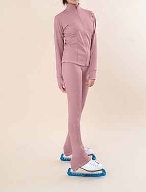 女性用ガールズアイススケートタイツトップとパンツ付きピンク高弾性トレーニング練習用プロスケートウェア長袖アイススケートフィギュアスケート
