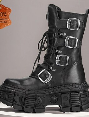 メンズゴシックパンクコンバットブーツ、本物の牛革、バックルストラップ、チャンキープラットフォームソール、パーティー、フェスティバル、ストリートウェア向けのオルタナティブファッションフットウェア