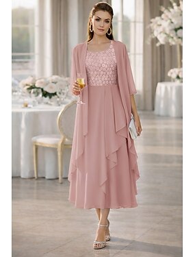 ツーピース Aライン セミロング丈 ウェディングゲストドレス マダムドS ハーフスリーブ スクープネック エレガント フォーマル ケンタッキーダービー セミフォーマル シフォン ショートジャケットドレス 〜と 刺繍 アップリケ カスケーディングラッフル