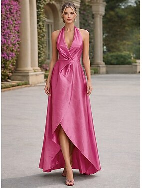 Aライン セミロング丈 カクテルドレス エレガント ハイ・ロー ノースリーブ Vネック ガーデンパーティー 結婚式 サテン タフタ バックレス とともに プリーツ