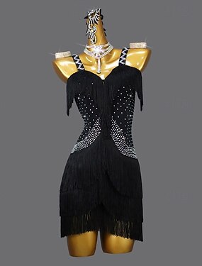 女性用ブラックダンスドレス - 精巧なデザイン、フリンジ/スパンコールのディテール、ラテンダンスに最適 &社交ダンスのパフォーマンス、練習 &ステージショー