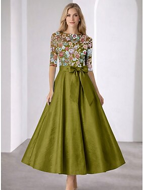 Aライン アンクル丈 セミロング丈 パーティードレス 二次会ドレス / カクテルドレス ウェディングゲストドレス カクテルドレス エレガント きらびやかな 七分袖 ボートネック ガーデンパーティー フォーマル ポケット タフタ スパンコール とともに フラワープリント リボン スパンコール
