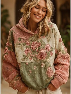 ウィメンズ 3D プリント ビンテージ ボヘミアン フーディ パッチワーク フーディ スウェットシャツ フローラル プルオーバー カジュアル ロングスリーブ フーディ ストリート デイリウェア パッチワーク プリント フロント ポケット ライトグリーン ダークピンク ネイビー スプリング フォール ウィンター