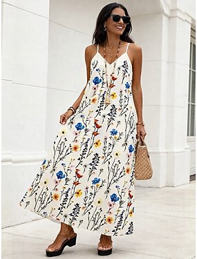 女性用 マキシドレス サンドレス A ラインドレス スリップドレス 旅行度假风 カジュアル ビーチ お出かけ ルーズフィット グラフィック トロピカル風 ノースリーブ Vネック ブラック ホワイト 夏 春