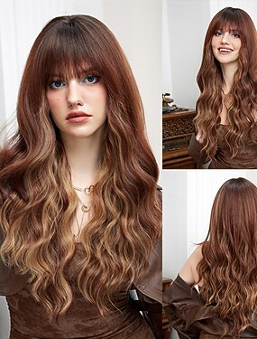 人工毛ウィッグ カール ウェーブ ニートバング バング付き 機械製 かつら 26 インチ ダークブラウン 合成 女性用 キュート コスプレ パーティー ダークブラウン